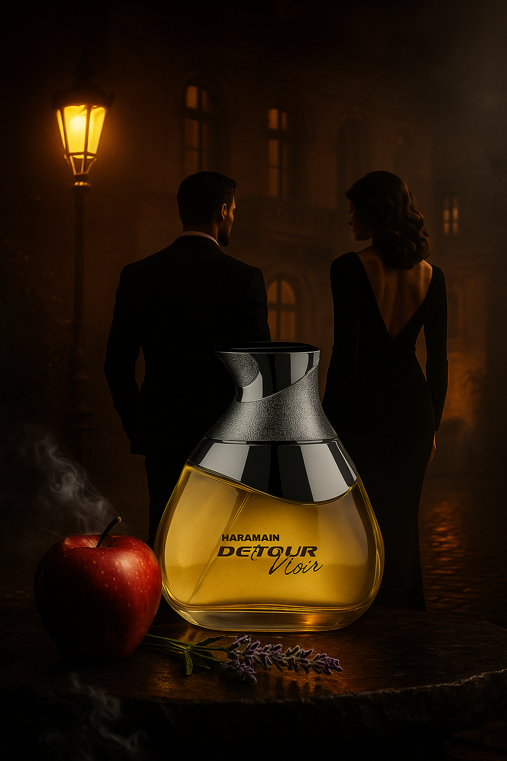 Detour Noir te envuelve con vibrantes notas de salida de manzana, lavanda, jazmín y violeta, evolucionando hacia un corazón dulce y especiado de vainilla, pachulí, bergamota y mandarina. Su base profunda y sensual de sándalo, cardamomo, pimienta, madera de guayaco y geranio crea una estela enigmática y duradera.